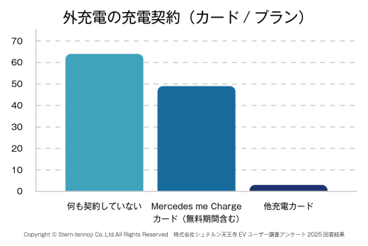 - 外充電の充電契約(カード/プラン)何も契約していない:53%。→ 自宅充電で賄えるため、外充電用カード/プランに加入しない傾向。