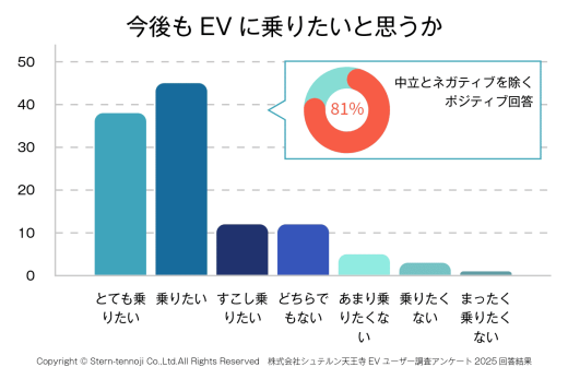 - 今後もEVに乗りたいと答えた割合:81%→大多数がEV利用に満足。